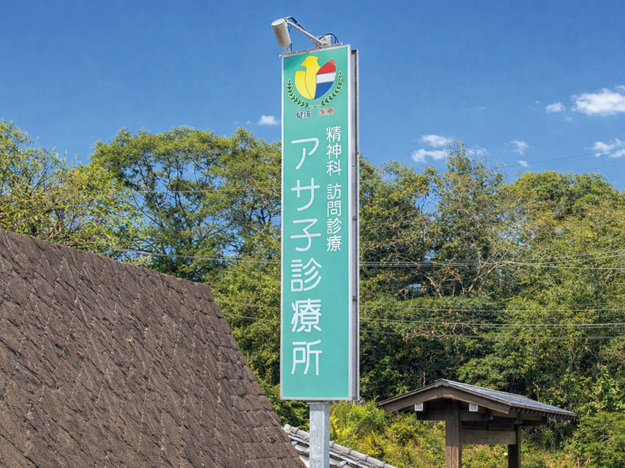 社会福祉法人民生会「アサ子診療所」様のマーク変更に伴い、自立サインの板面張替え作業を行いました。 インクジェット(サイズ600×2700)。LED含む。